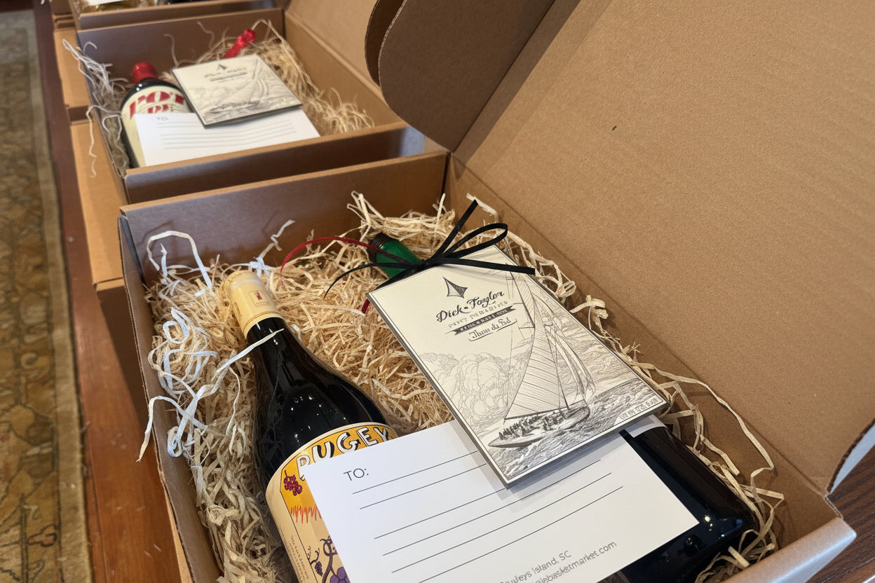 A holiday gift, filled with two premium wines, artisan goods, and seasonal touches — beautifully packaged and ready to deliver.
